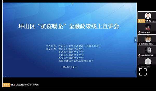 3月11日,坪山区工业和信息化局组织召开坪山区“抗疫暖企”金融政策线上宣讲会,辖区500余家企业参与,近1300人次观看。